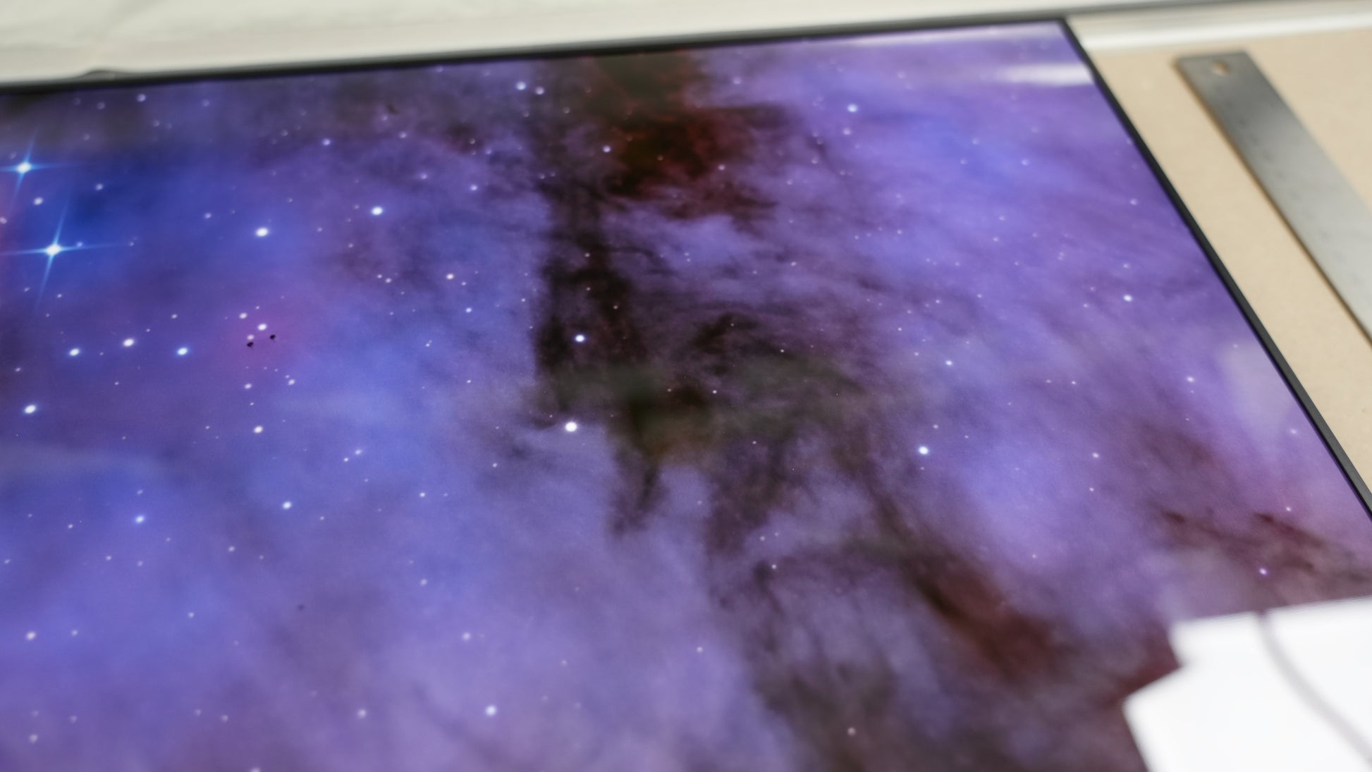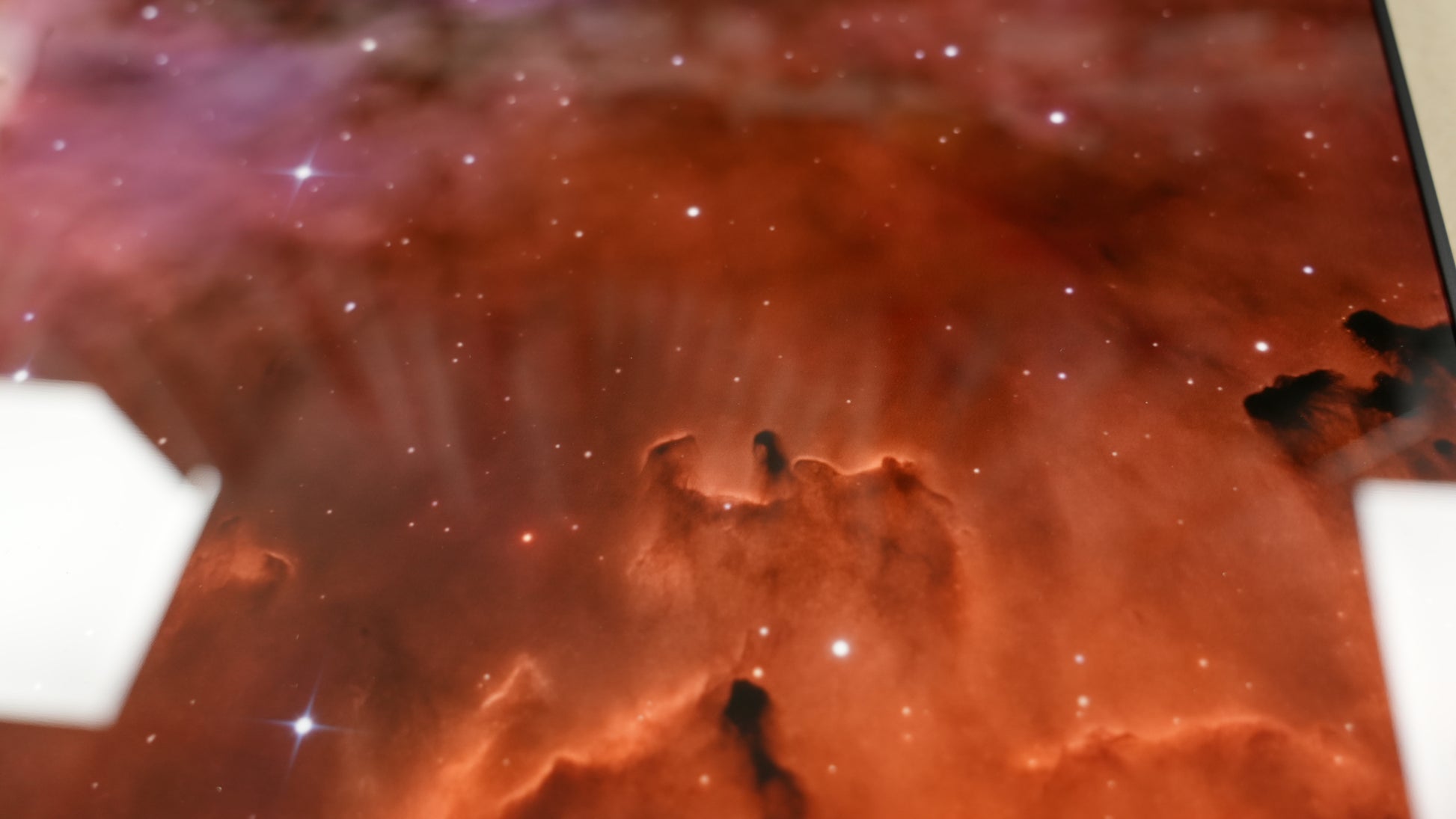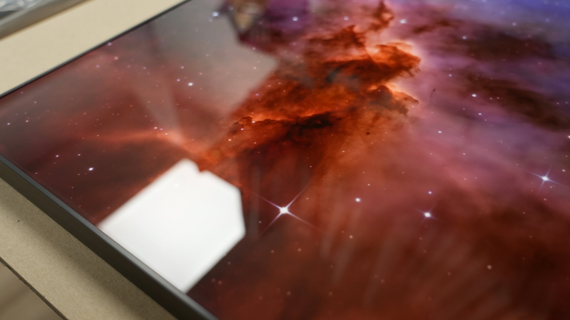 White glossy finish reflects light with no diffusion. Glares from windows and other sources of natural light may be visible. We recommend displaying this style in a space where lighting can be controlled.
