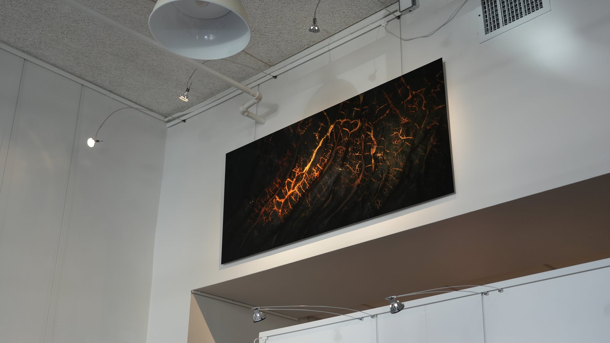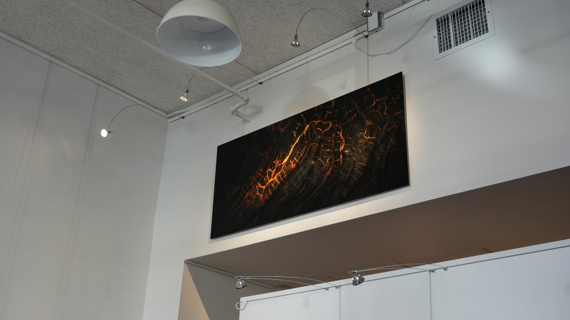 White glossy finish reflects light with no diffusion. Glares from windows and other sources of natural light may be visible. We recommend displaying this style in a space where lighting can be controlled.