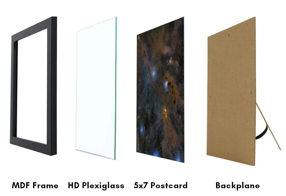 The postcard is tastefully presented in a sleek black MDF frame, designed to fit the 5x7 inch postcard. The HD Plexiglass provides clarity and durability, and the backplane ensures stability.